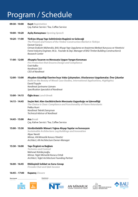 BAU Ahşap Yapı Uygulama ve Araştırma Merkezi, BAU Mimarlık ve Tasarım Fakültesi ve Finlandiya merkezli Nordtreat firması iş birliğiyle düzenlenen bu seminerde sizleri; ahşabı modern bir yapı malzemesi olarak yeniden keşfetmeye, yenilikçi tasarımı, yangın güvenliğini ve sürdürülebilir inşaatı destekleyen özel çözümleri tanımaya davet ediyoruz.